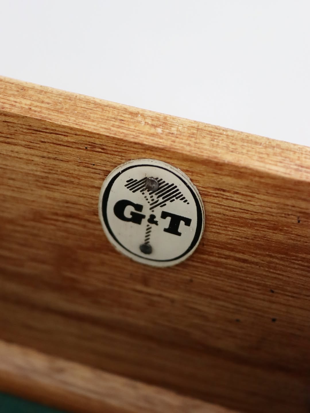 Mid-Century sideboard by British furniture manufacturer Greaves & Thomas, 1950’s. Features beautiful brass detailing, original brass drawer handles, four drawers, a drop down cabinet and the original attribution mark
