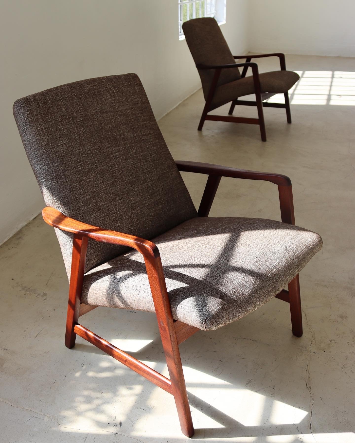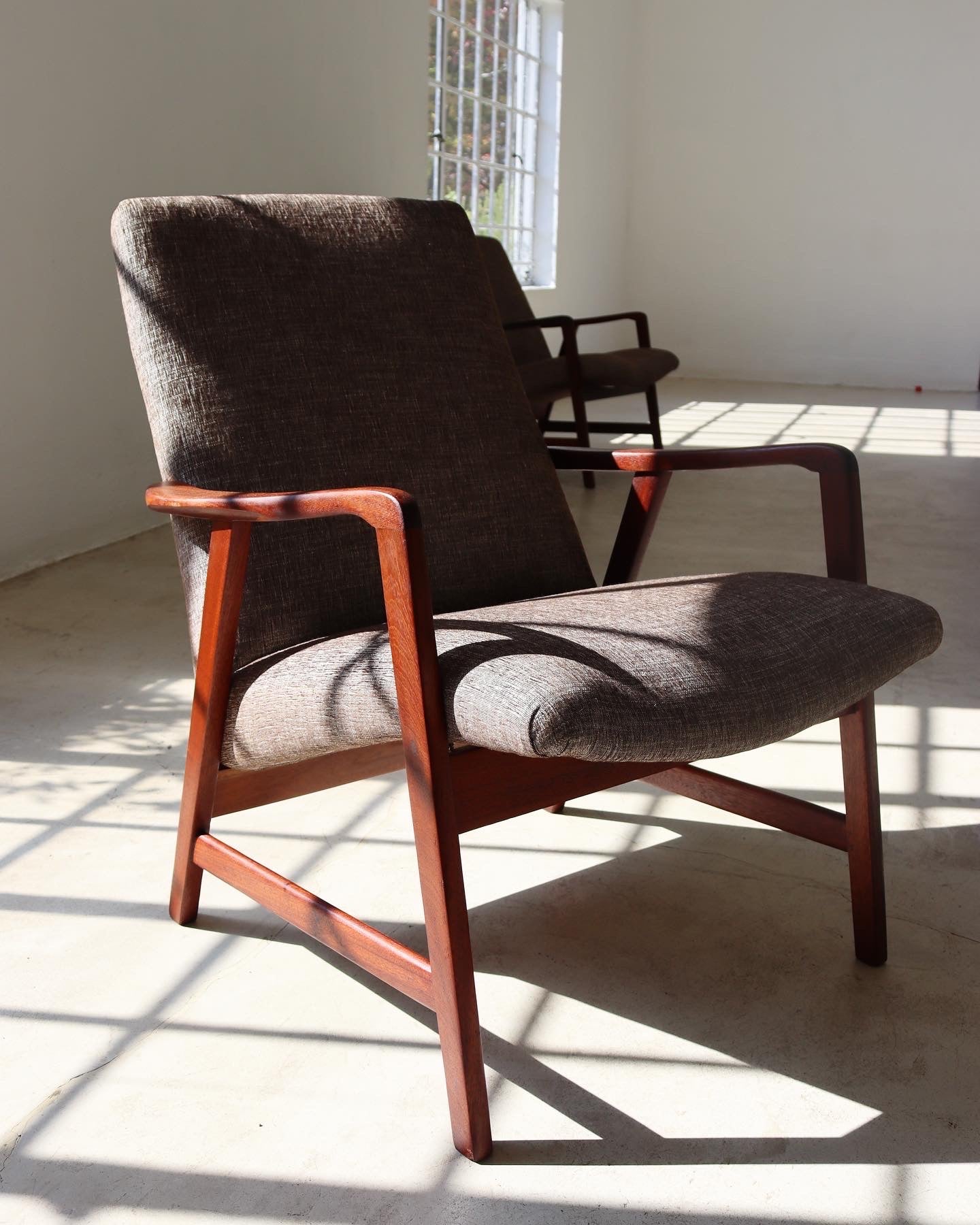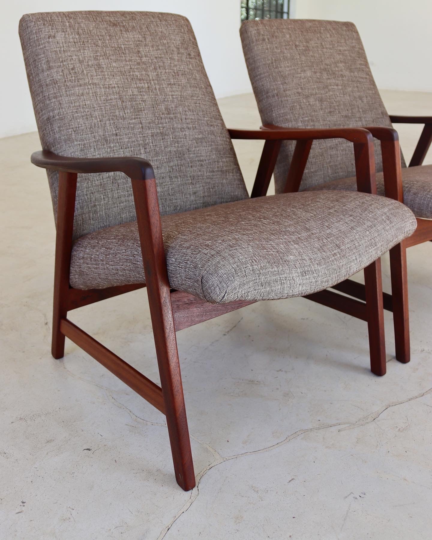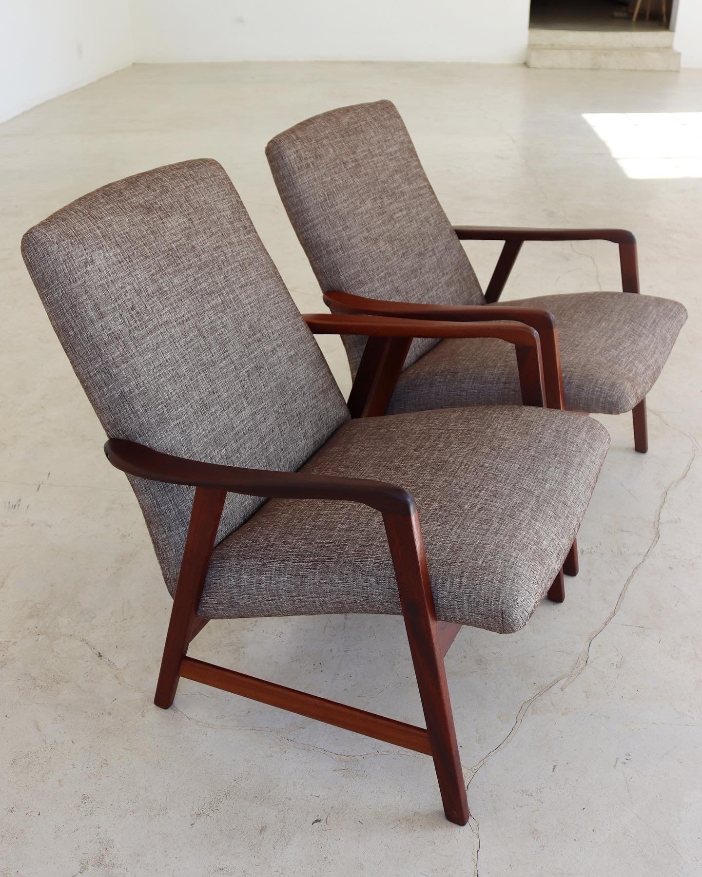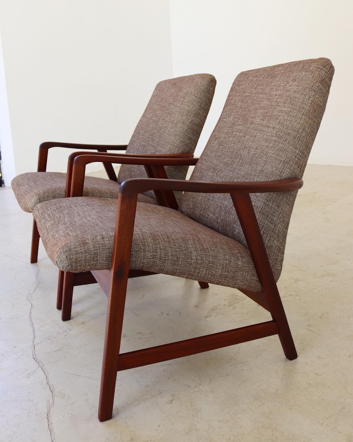 A beautiful set of two Mid-Century Danish style occasional arm chairs. These chairs are perfect for those who appreciate timeless design, quality craftsmanship, and functional elegance
