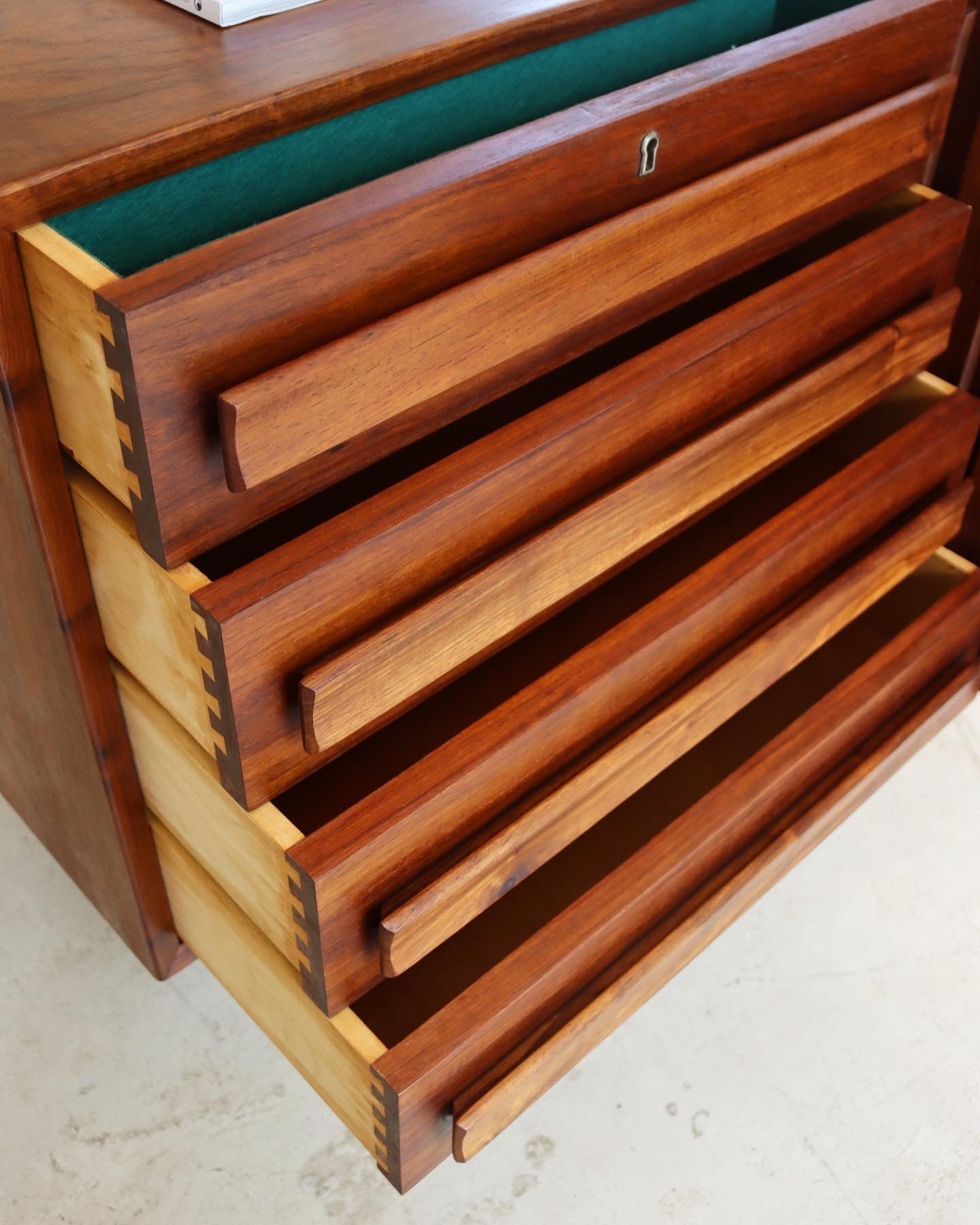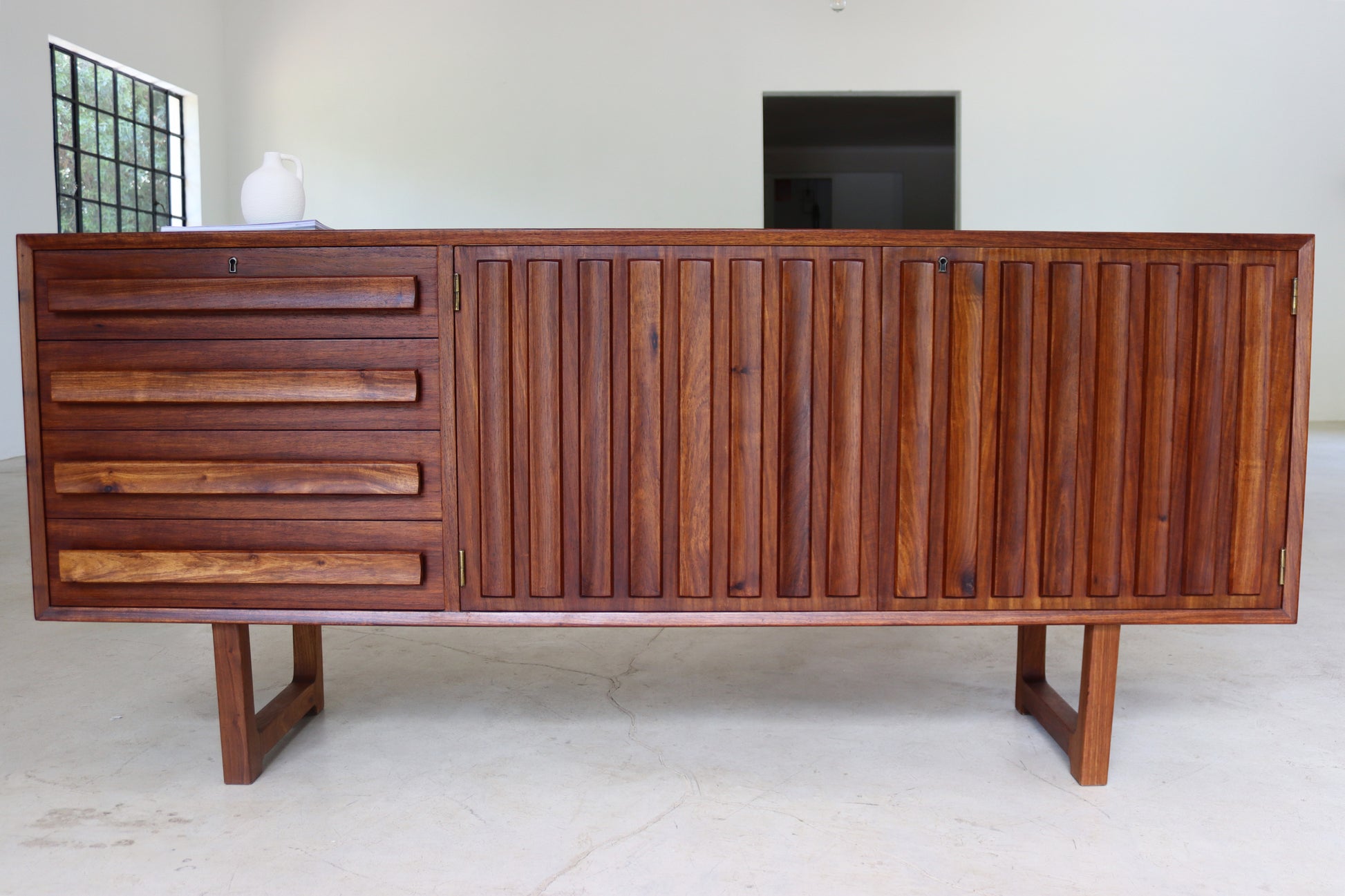 A stunning Danish style solid walnut sideboard. Features unique slatted doors, 4 slatted drawers and sled legs. The back is also beautifully finished in walnut therefore can be used as a free standing item