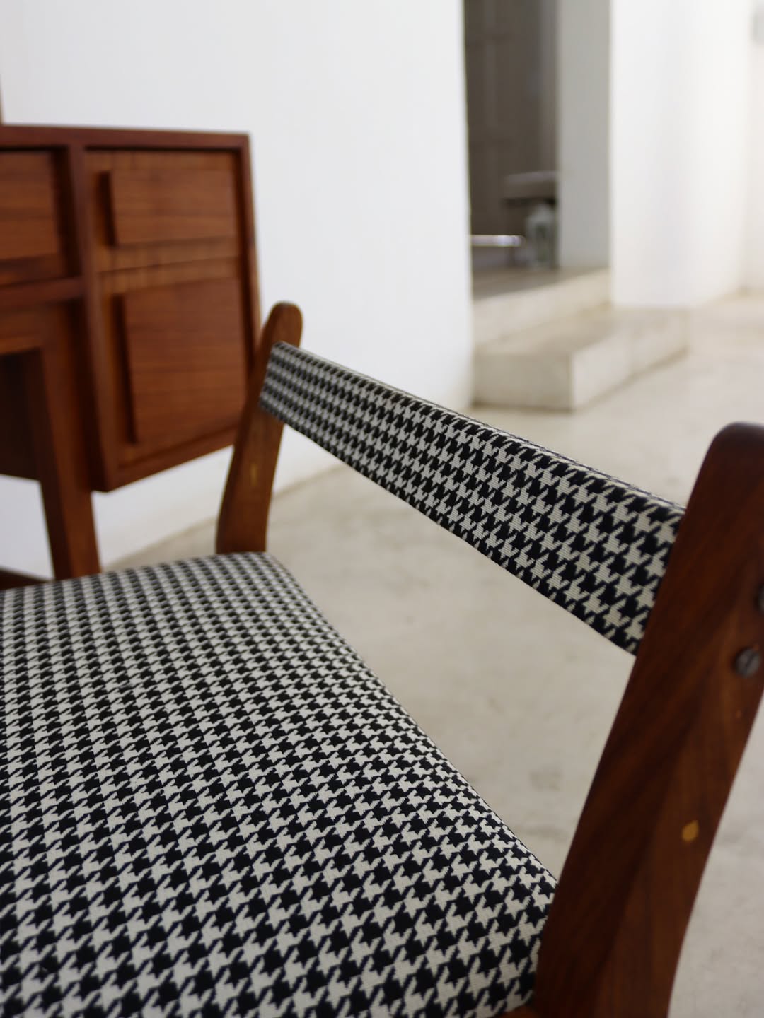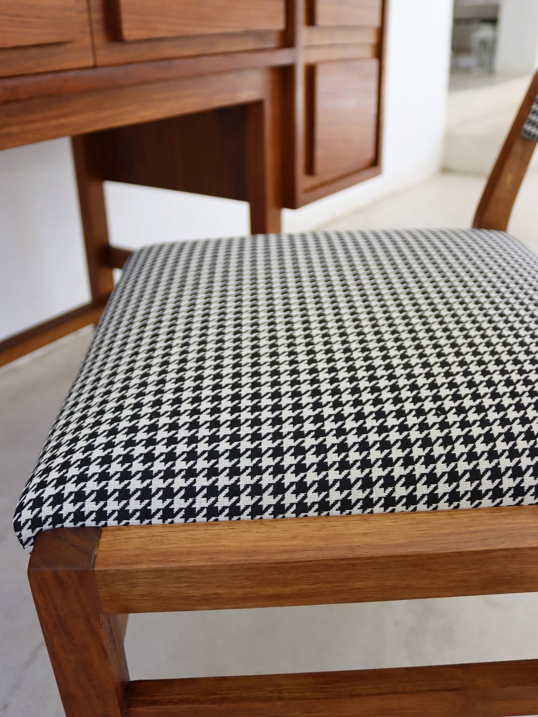 Wood has been fully restored. Stool has been reupholstered in high quality houndstooth fabric
