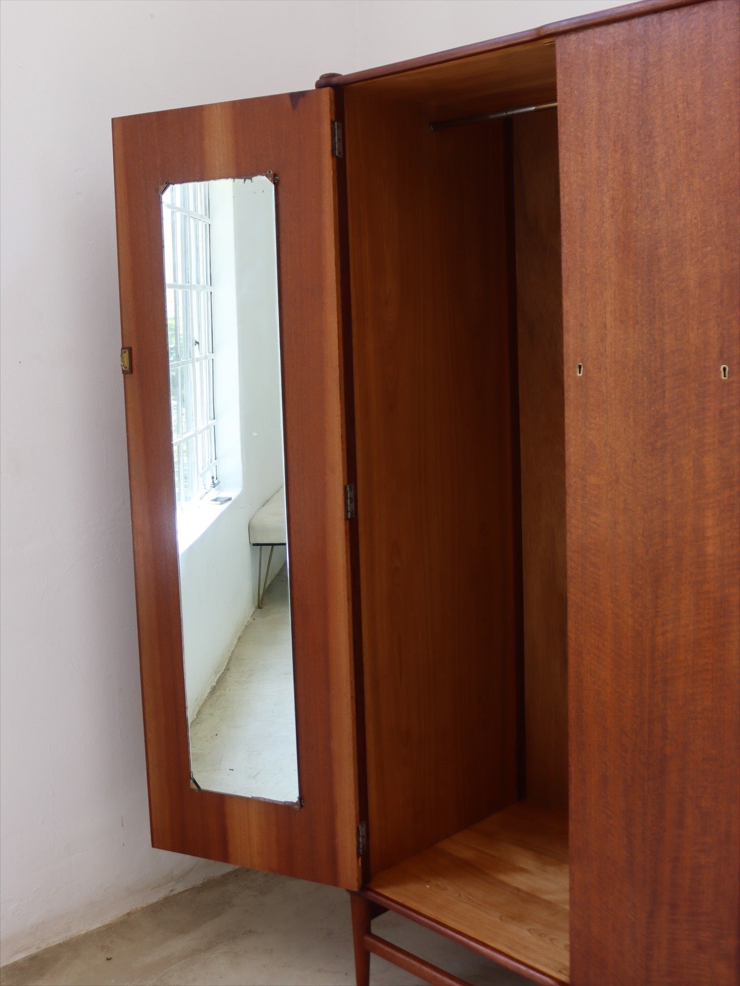 Mid-Century modern Scandinavian style wardrobe with long vertical sculpted handles and tapered legs. Features three drawers, hanging space, a mirror and shelving