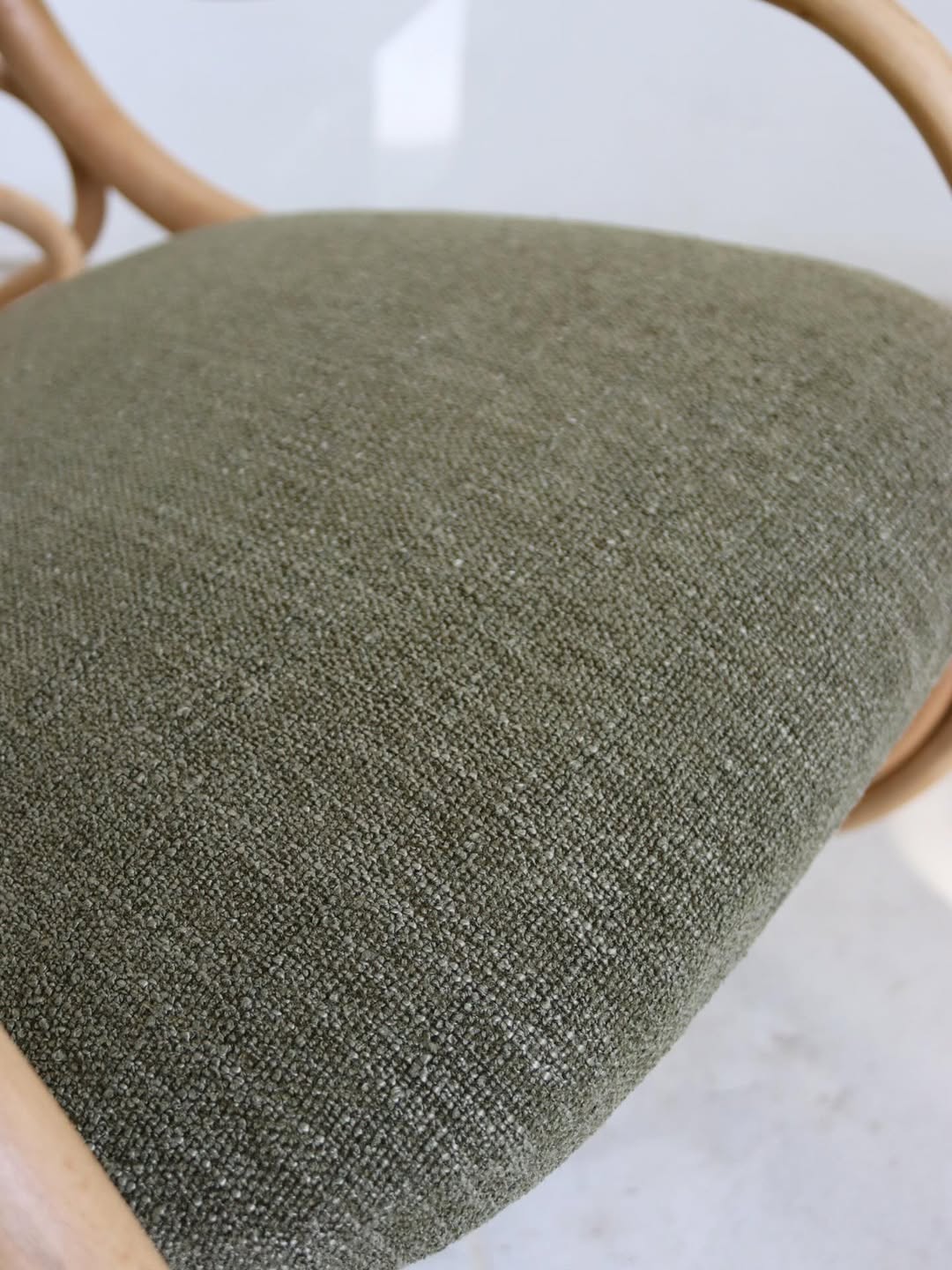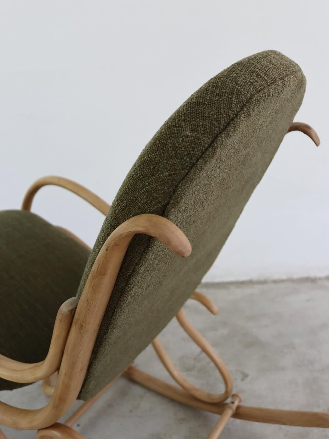 Fully restored. The wood has been stripped, sanded and resealed. The joints have been stabilised and the seat + back have been reupholstered in high quality fabric from Hertex
