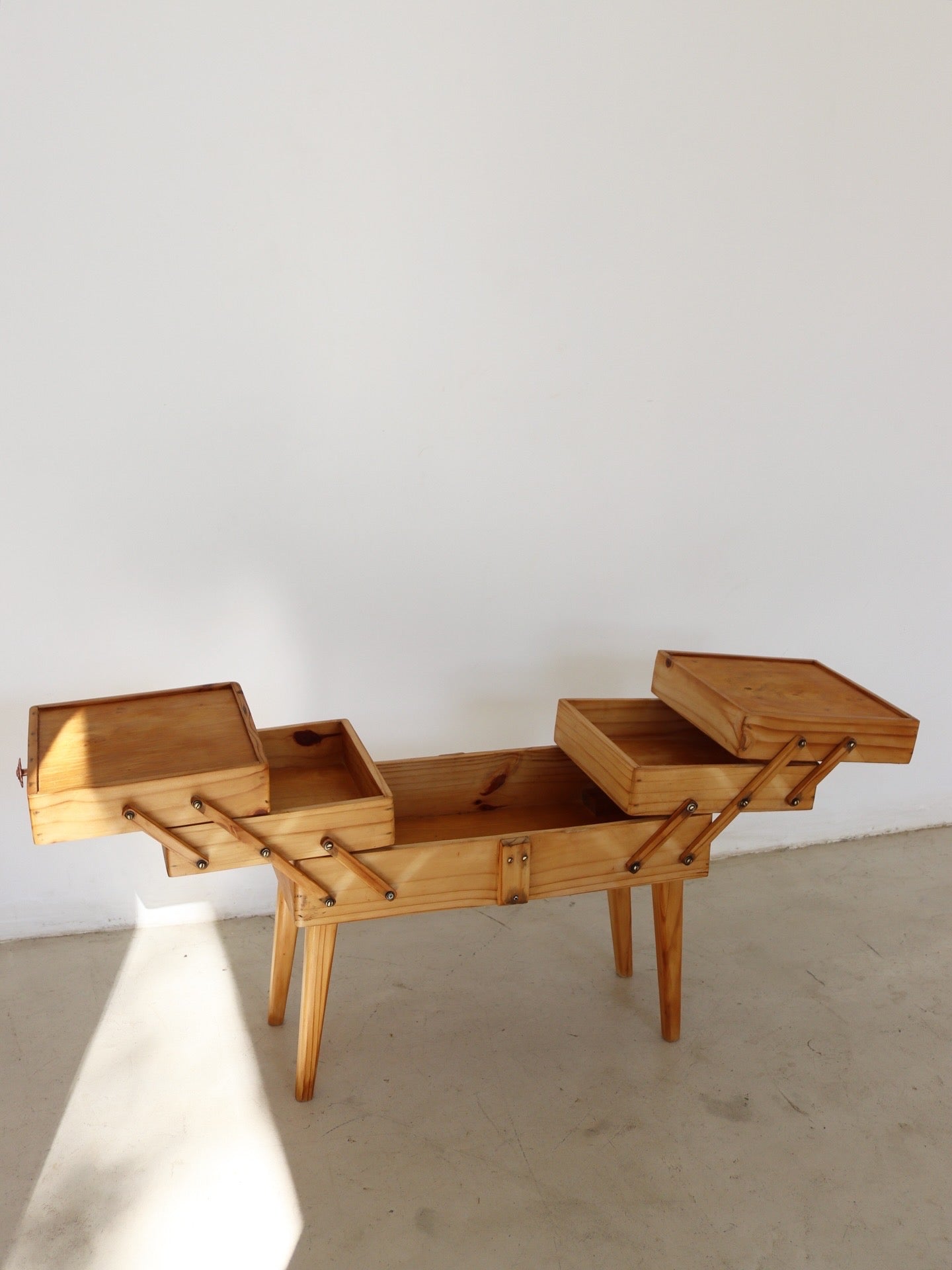 A stunning and unique vintage sewing storage box with multiple storage compartments and original handles. Folds open on both sides. Can be utilised as a makeup/cosmetics organiser